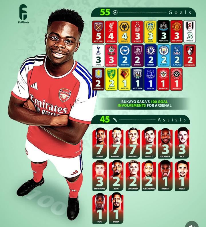 萨卡英超参与进球全纪录: